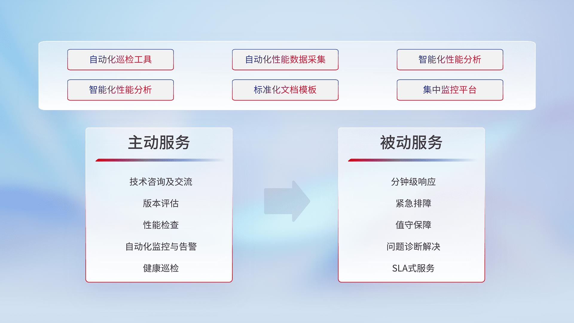 智能化工具和标准化文档,,,,保障服务质量,,提供主动服务(包含技术咨询、、版本评估、、、性能检查、、、自动化监控与告警、、、、健康巡检)和被动服务包含(分钟级响应、、紧急排障、、、、值守保障、、、、问题诊断解决、、SLA服务)。。