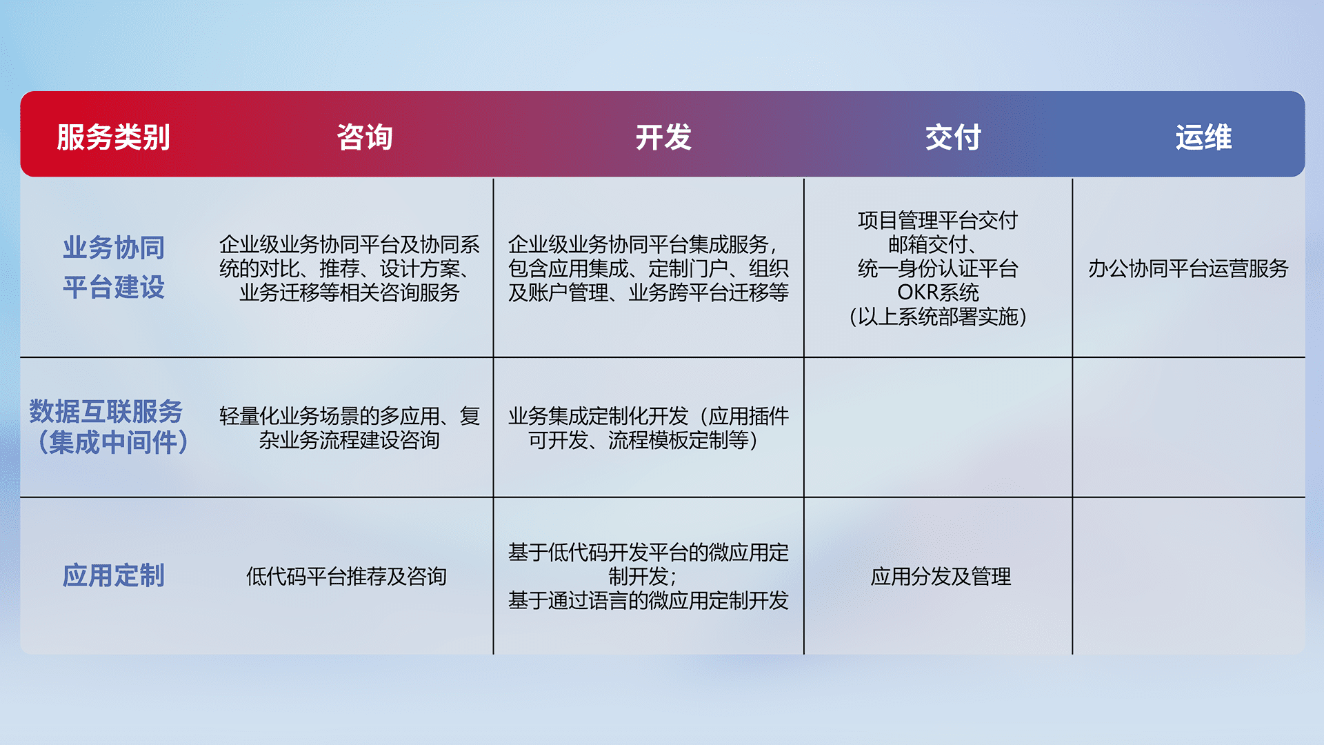 针对钉钉、、企微、、、IDaas等平台级产品提供产品的规划、、方案、、交付、、、定制化开发等服务,,,实现如统一协同办公、、、智能客户服务、、、混合会议管理、、、智能数据查询、、、等业务场景,,,,实现数字化转型。。